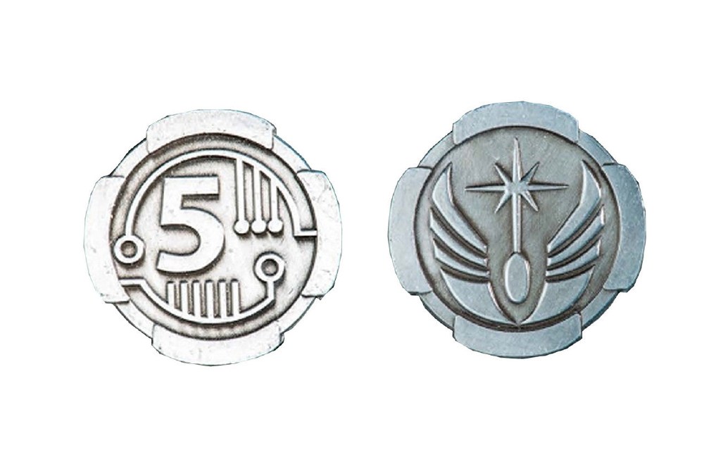 The Sci-Fi 5 Credit coins are circle shaped and have an lightly aged silver finish.